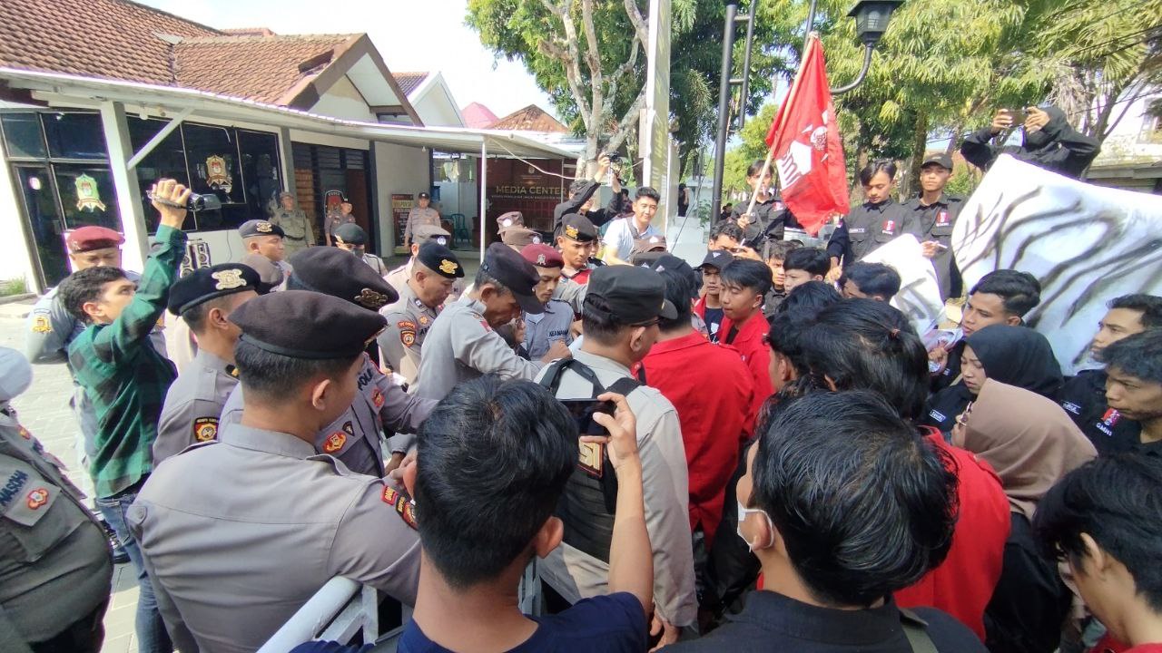PACITAN – Puluhan massa yang tergabung dalam Gerakan Mahasiswa Nasional Indonesia (GMNI) Pacitan menggeruduk kantor Komisi Pemilihan Umum (KPU) Kamis, (30/05/24) siang. Sempat terjadi bersitegang antara mahasiswa dengan aparat yang berjaga saat para mahasiswa ini mencoba menerobos masuk ke halaman kantor KPU.