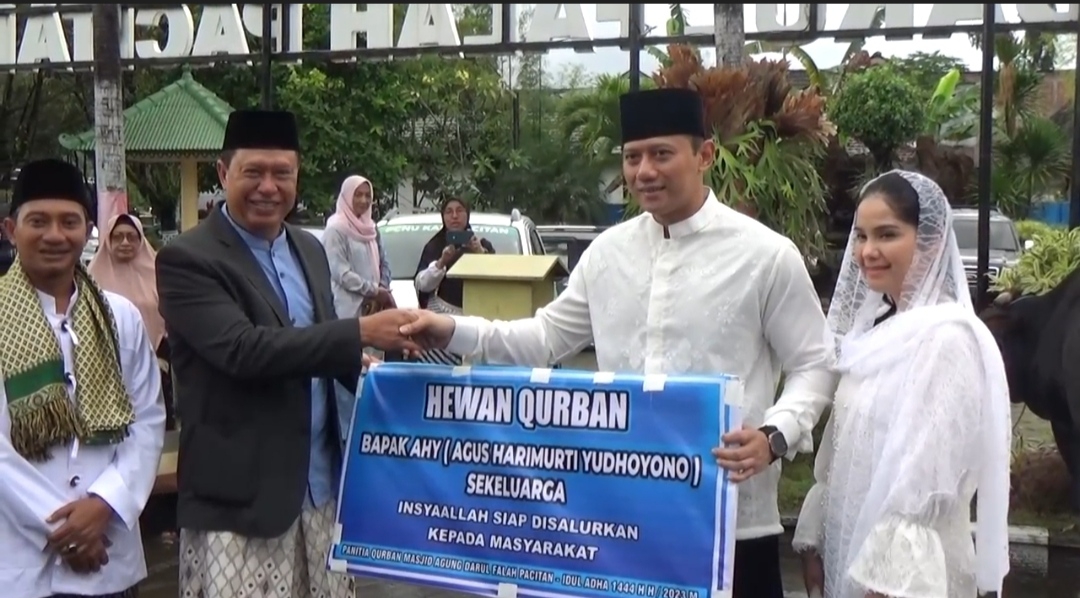 PACITAN – Momentum Hari Raya Idul Adha 1444 Hijriah, keluarga Presiden ke-6 RI Susilo Bambang Yudhoyono (SBY) berkurban dikampung halaman. Penyerahan hewan kurban berupa tiga ekor sapi dilakukan oleh putra sulung SBY, Agus Harimurti Yudhoyono (AHY) usai melakukan sholat ied di Masjid Agung Darul Falah.