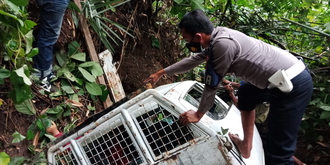 “Ketika Kendaraan R4 Mitsubishi Strada Warna Putih, yang di kemudikan Sdr. Ardian yang berpenumpang sejumlah 8 orang melaju melintasi jalan rabatan, disaat mobil dalam kondisi menanjak pengemudi terlalu mengambil jaluk ke kiri sehingga roda kiri terperosok ke sungai, “kata Kanit Laka Lantas Polres Pacitan IPDA Amrih Widodo (20/01) sore.