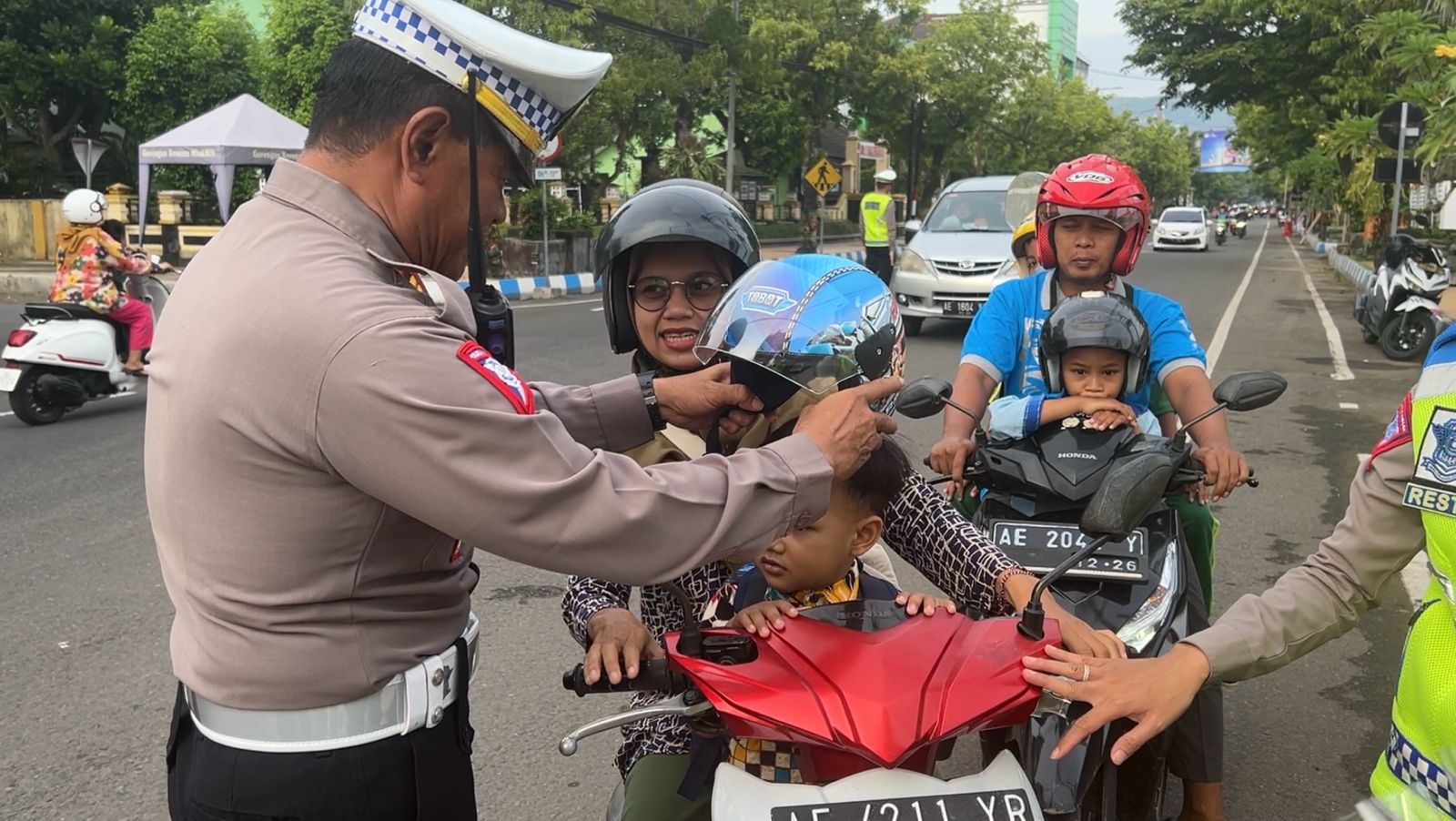 Mayoritas pelanggar yang terjaring razia yaitu orang tua yang membonceng anaknya tanpa dilengkapi helm. Selanjutnya pelanggar dihentikan petugas serta diberi imbauan dan diberikan helm.
