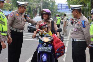 “Jadi bagi-bagi helm, bunga, dan coklat kepada pengguna jalan ini merupakan bentuk kepedulian kami Satlantas Polres Pacitan, utamanya pelanggar yang membonceng anaknya namun tidak dilengkapi helm, ” katanya.