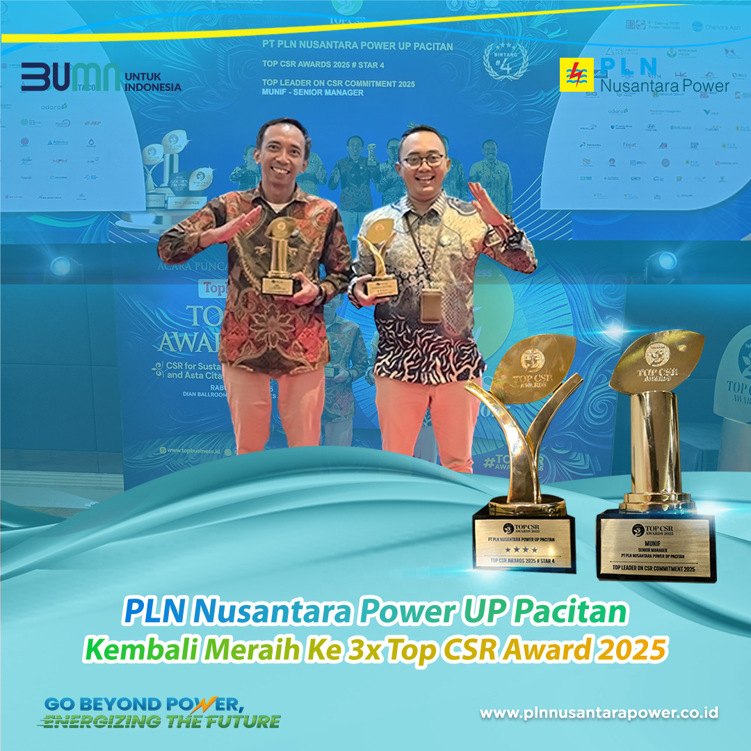 PLN Nusantara Power UP Pacitan kembali menorehkan prestasi gemilang di bidang Corporate Social Responsibility (CSR). Kali ini, PLN NP, termasuk Unit Pembangkitan Pacitan (UP Pacitan) berhasil memperoleh penghargaan bergengsi TOP CSR Award 2025 pada Rabu (12/6). Dua penghargaan berhasil diraih pada event ini, yaitu Top CSR Award #Star 4 dan Top Leader On CSR Commitment oleh Senior Manager UP Pacitan, Munif.