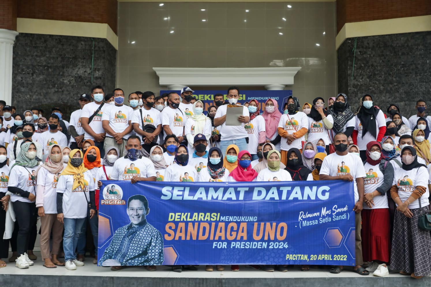kabarpacitan – Ratusan elemen masyarakat yang terdiri dari emak-emak, milenial, pelaku UMKM, hingga nelayan mendeklarasikan Menparekraf Sandiaga Uno di Pantai Pancer Door, Pacitan, Jawa Timur. Mereka yang tergabung dalam Massa Setia Sandi Pacitan ingin Sandiaga maju menjadi presiden Republik Indonesia 2024.