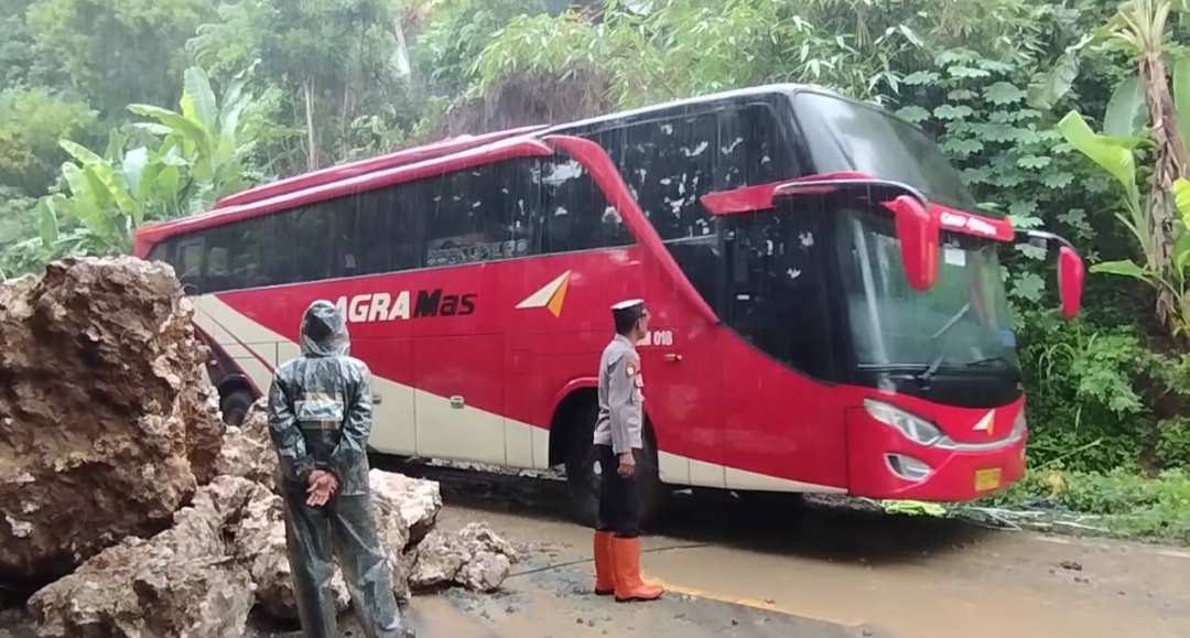 PACITAN – Setelah setempat tertutup bongkahan batu besar hingga berjam-jam, jalan nasional ruas Pacitan- Solo tepatnya di Lingkungan Tamperan, Kelurahan Sidoharjo, Kecamatan Pacitan sudah kembali dapat dilalui kendaraan. Pembersihan material longsor melibatkan 3 alat berat selama kurang lebih 2 jam lamanya.