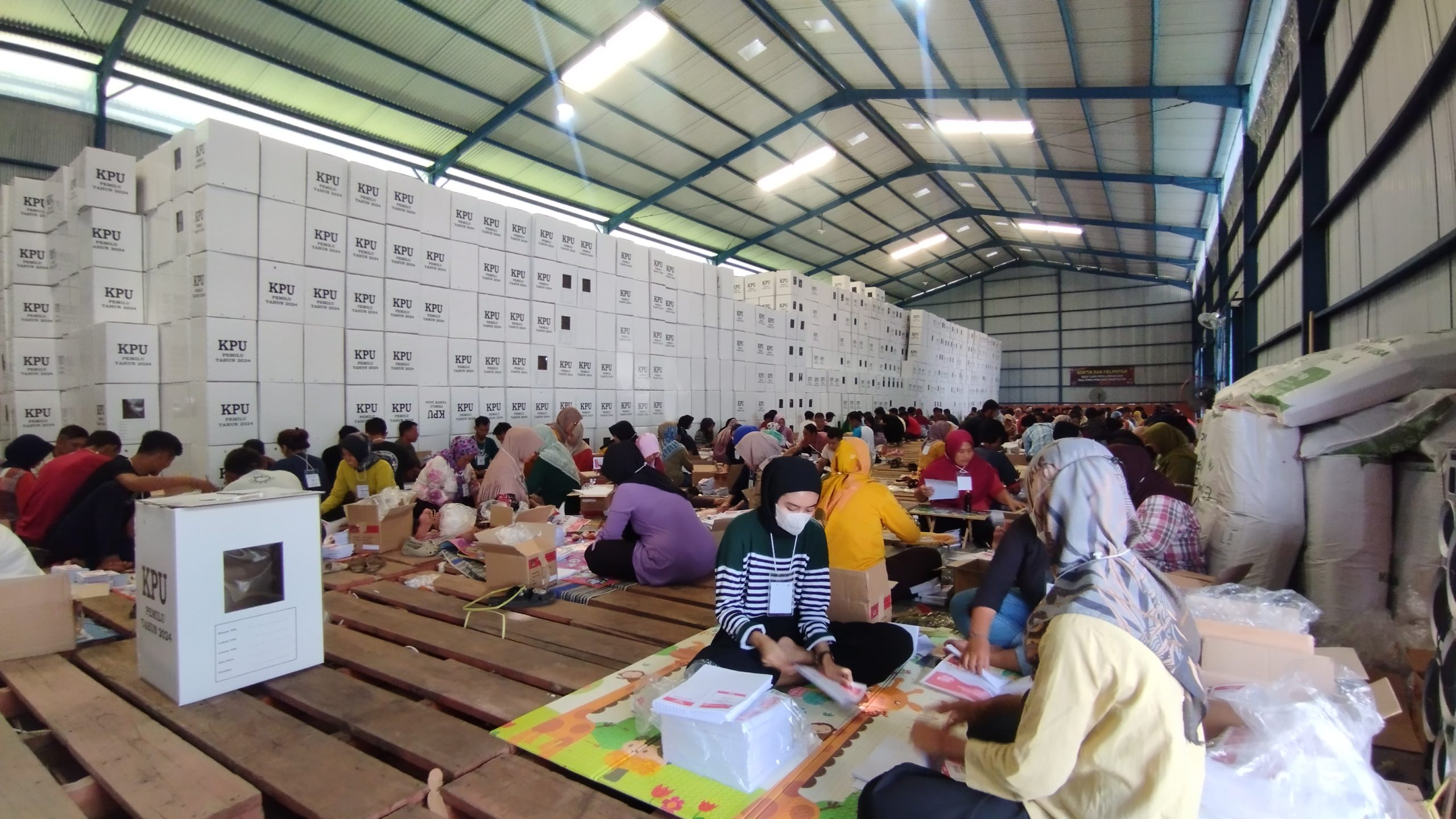PACITAN – Bertempat di Gudang Bulog yang berada di Kelurahan Sidoharjo, Kecamatan Pacitan, Kabupaten Pacitan, sortir dan pelipatan surat suara pada Pemilu 2024 sudah mulai dilakukan. Dalam penyortiran dan pelipatan surat suara kali ini setidaknya melibatkan sekitar 200 warga yang sebelumnya telah melalui penyaringan oleh Komisi Pemilihan Umum (KPU) setempat.