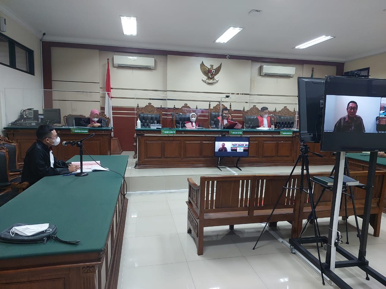 Majelis hakim dan Panitera Pengganti, Jaksa Penuntut Umum serta Penasehat Hukum posisi nya berada di Pengadilan Tindak Pidana Korupsi pada Pengadilan Negeri Surabaya. Sedangkan terdakwa berada di Cabang Rumah Tahanan Klas I Surabaya pada Kejaksaan Tinggi Jawa Timur.